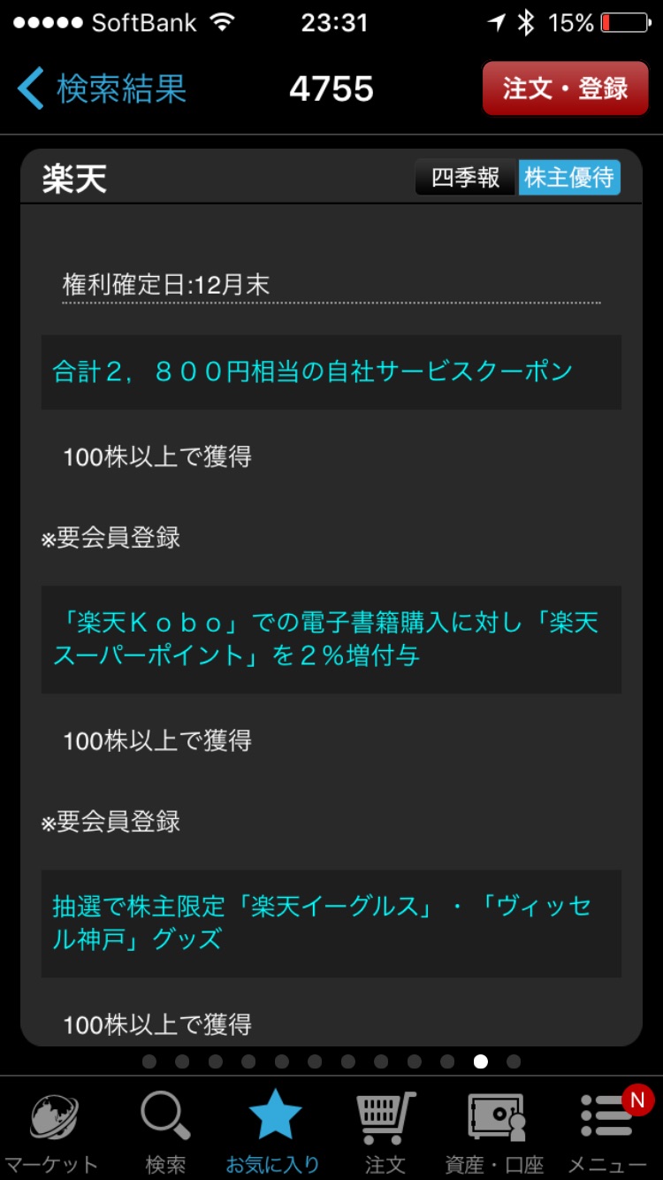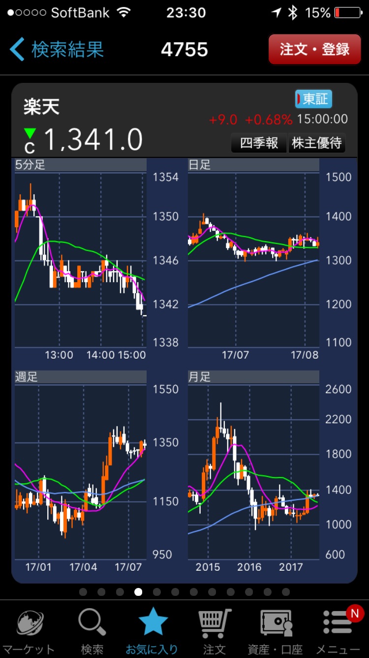 働きながら投資をする方の場合、PCで見るよりも通勤中にスマホで見るようなケースが多いと思います。楽天証券のスマホアプリは超優秀でして、チャートは1画面で「5分足」、「日足」、「週足」、「月足」がまとめて閲覧可能。また株主優待の内容や個別に企業ごとの関連ニュース、アナリストの業績予想、過去数年間の業績情報...など11ページもの充実した情報がスマホからだけで閲覧が可能です。
